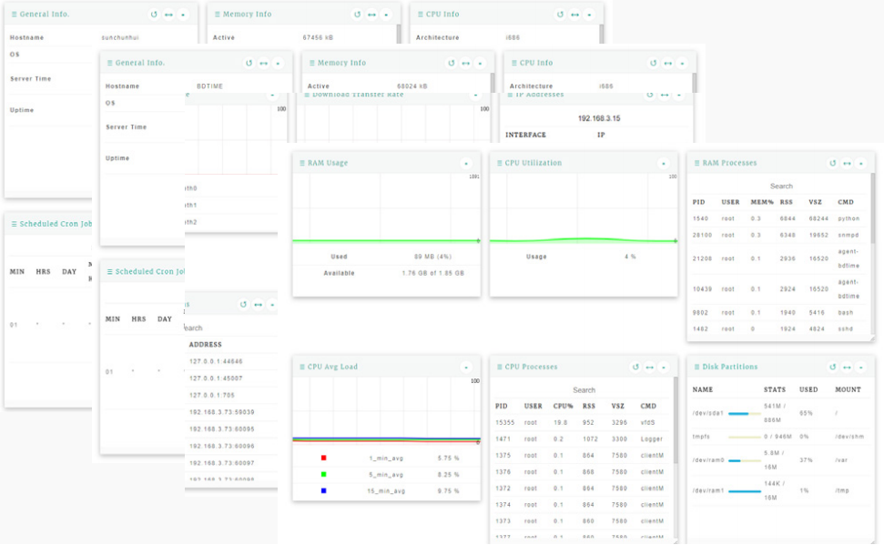实时监控统状态,包括 RAM、CPU 利用率及进程、CPU 平均负载、磁盘分区信息、系统正常工作时间、系统正在运行时间等;显示系统信息,包括主机名称、操作系统内核版本、内存、CPU 信息、系统定时任务等;实时监测网口传输速率,监测网络连接,ARP 缓存表,网口带宽显示;可直接查询最近登录服务器的 IP 地址和登录日期,及正在登录账户信息。