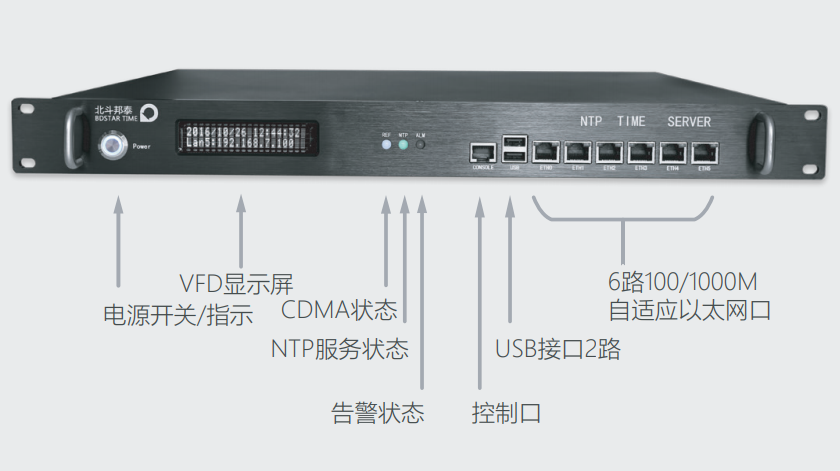 独特的嵌入式 硬件设计、高效 Linux 操作系统,可灵活扩展多种时钟信号输出。全面支 持最新 NTP 对时协议、MD5 安全加密协议及证书加密协议,时间精度优 于 2 毫秒。同时支持 TOD、日志记录、USB 端口升级下载和干接点告警功能, 配合北斗邦泰自主研发的全网时间统一监控软件,轻松实现网络时间同步 及有效监控。