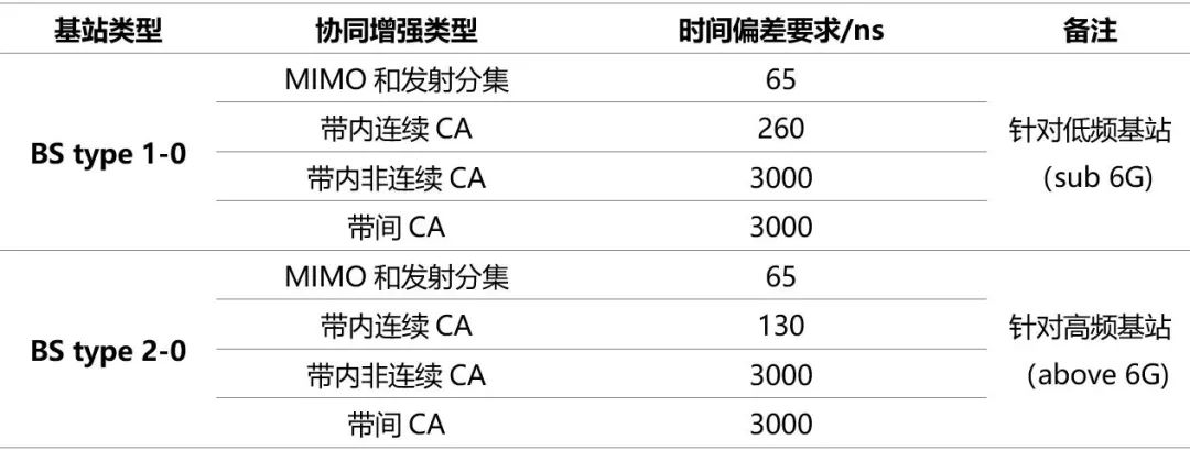 站间协同增强可让一个用户的数据通过不同的AAU收发,用户可以在重叠覆盖区域合并多个信号,从而提升带宽体验。不同AAU的信号之间,时差必须满足一定要求,否则无法合并。根据3GPP TS 38.104V15.00(2017-12)技术要求,不同类型的协同增强要求如表1所示。