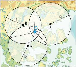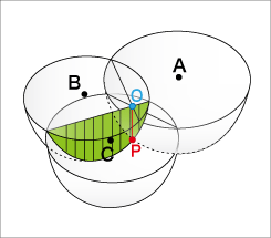 但是,如果只从一个观察点观察,我们只能看到震中在该点的半径(r)内。如果我们知道三个观测点(A、B、C)的距离和它们各自的半径'(rA、rB和rC),就可以推导出震中(P)在三个球面的交点处。