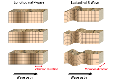 地震波大致可分为三种类型:具有类似于声波的压缩结构的纵向 P 波、扭转纬度 S 波和表面行波。地震从轻微的震动和嘎嘎声开始,然后持续到更大的颤抖。第一次轻微的震动是由 P 波引起的,而大的震颤是 S 波活动的结果。