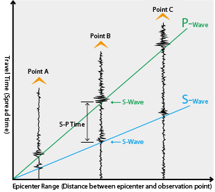 到震中的距离(r)可以通过使用P波和S波之间的时间和速度差(SP时间)来计算。