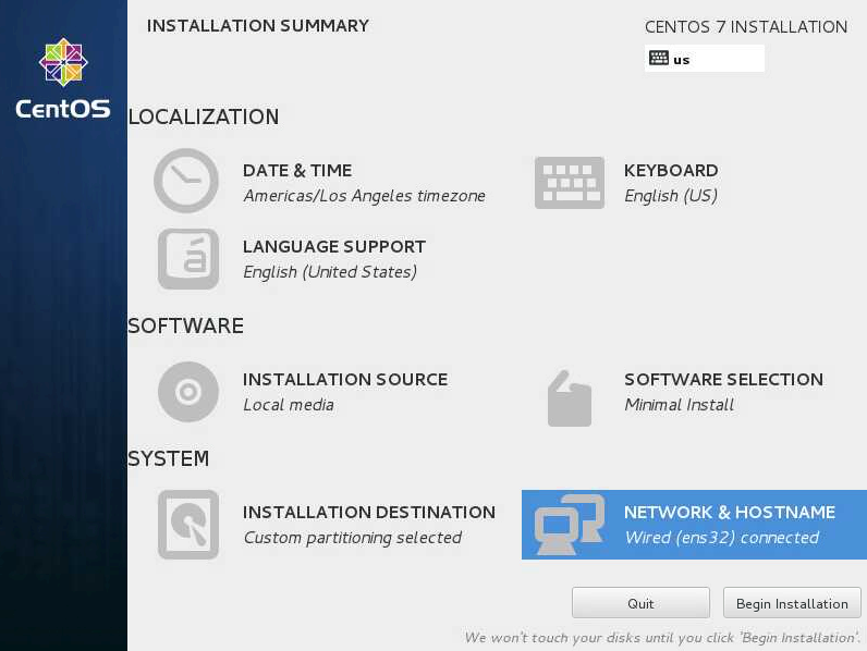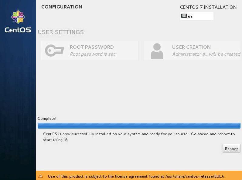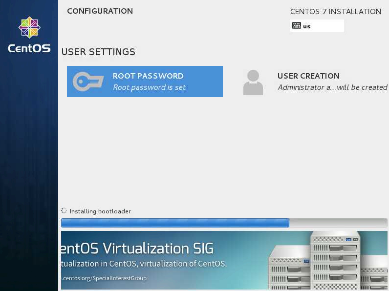 安装过程正在进行时,单击 ROOT PASSWORD 和 USER CREATION 以完成配置,如下所示。