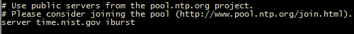 NTP 服务器池建议使用“server time.nist.gov iburst”(http://tf.nist.gov/tf-cgi/servers.cgi)