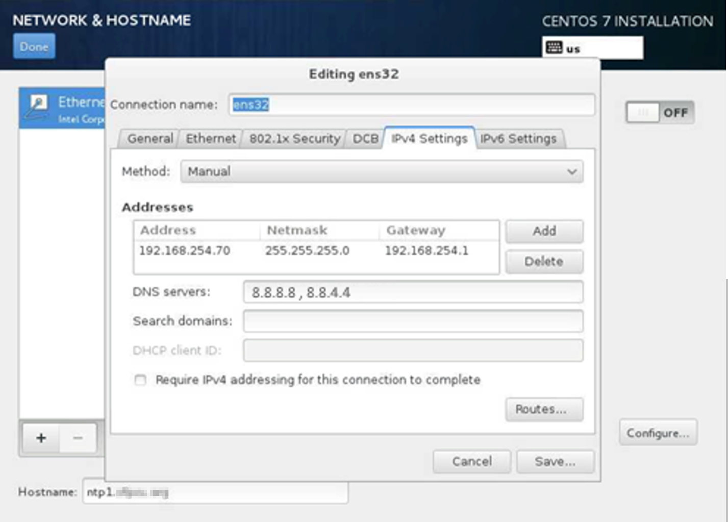 NETWORK & HOSTNAME:在 Hostname 框中输入 FQDN,然后单击“Configure...”,然后如下设置 IPv4。
