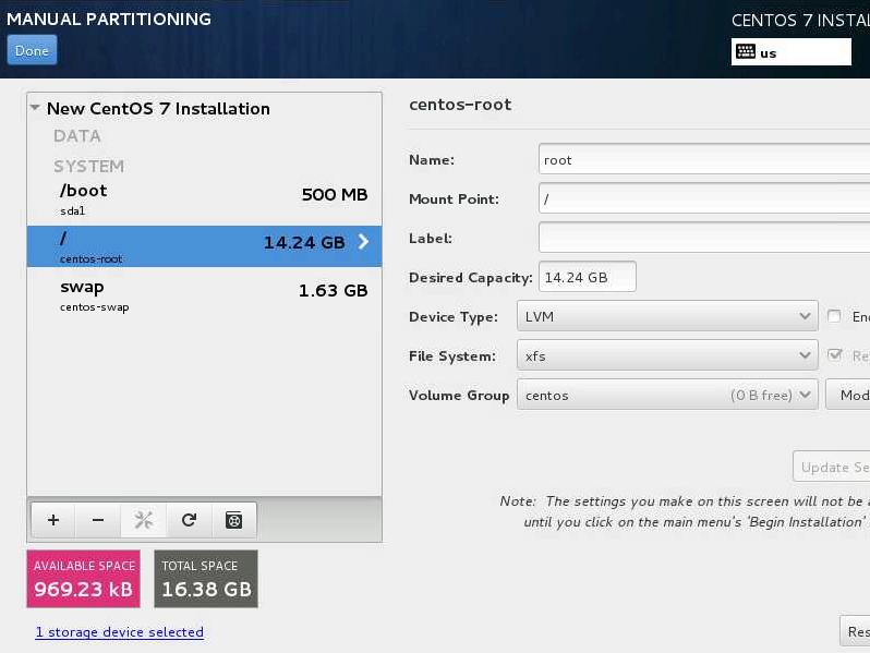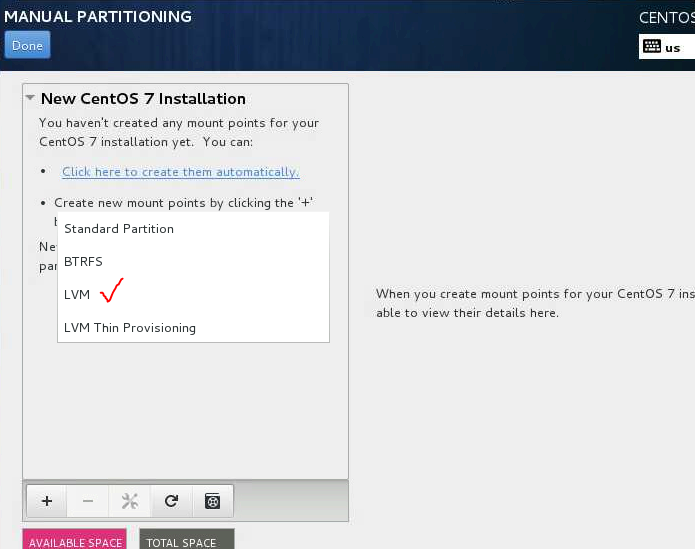下一个屏幕:选择 LVM,然后单击“单击此处自动创建它们”。